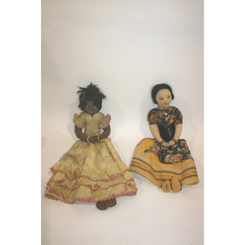 two nightdress cases, the cloth dolls with large dresses. One with a label on the foot, Norah Wellings. Doll with label 19ins (49cms) high. (2)