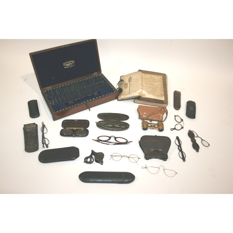 including a mahogany cased set of lenses by Paetz & Flohr, various antique spectacles and cases including a silver example, cased Opera glasses by Pompadour, Paris, and a variety of other optical equipment. Also with two books, The Art of Preserving Light (1815), and A Treatise of the Physiology and Diseases of the Eye (1835), both in mixed condition.
