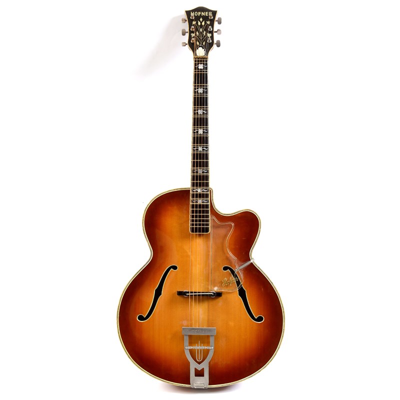 a Brunette Committee Guitar, with a spruce top and birds eye maple back and sides. With a 23 fret ebony finger board and mother of pearl inlay, and in a fitted case. With a label inside, Hofner Committee, 4256, 5113/05. 106cms long