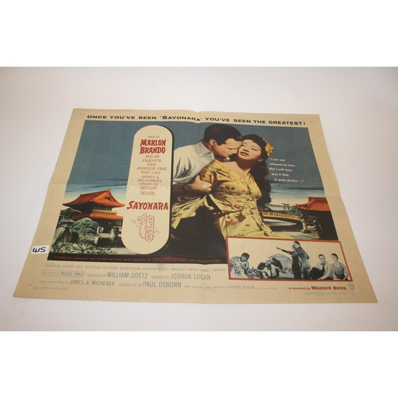 6 film posters including Support Your Local Sheriff, The Power, Johnny Reno, War Italian Style, Timbuktu and Sayonara (Marlon Brando). Timbuktu and Sayonara 28ins by 22ins (American Landscape format), the others 40ins by 27ins (American Portrait Format). (6)