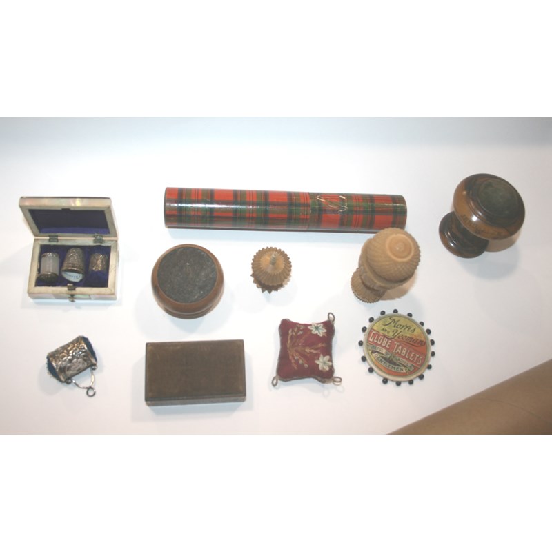 including a Tartanware needle case, a small mother of pearl and abalone shell box containing a silver thimble and other items, a Tunbridge Ware pincushion and other pin cushions, various silver and plated thimbles, wooden lace bobbins, and other needlework accessories.