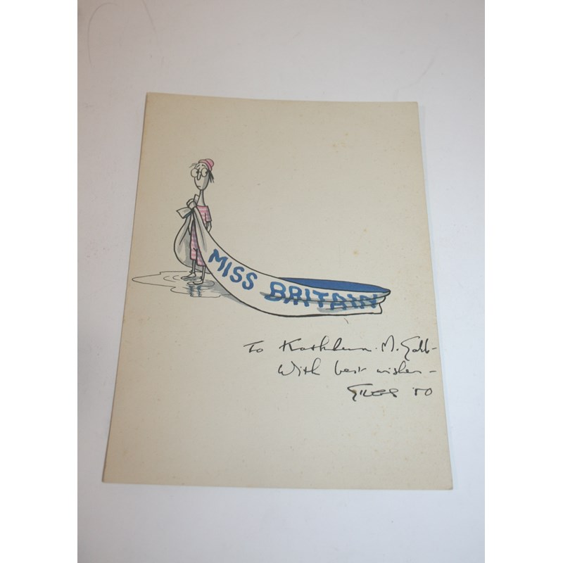 Ronald Carl Giles (1916-1995) a pen and ink drawing on card of Vera titled 'Miss World', with an inscription below To Kathleen M Gabb, With Best Wishes - Giles. With an accompanying letter and envelope, the letter reads 'Dear Miss Gabb, I am afraid I was unable to use your suggestion for a cartoon, but I enclose a personal sketch of Vera for you with many thanks for your nice note, Sincerely Giles, dated 31st July 1950. Card 24cms by 17cms