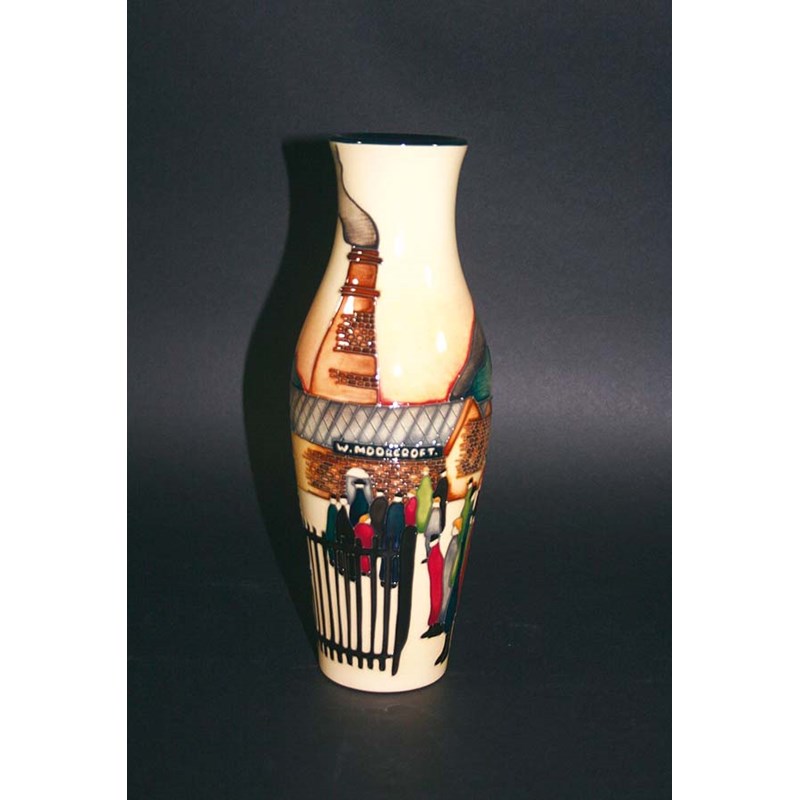 a modern limited edition Moorcroft vase, with depictions of the Moorcroft Factory. In the Recession in the Potteries design, No 94/100 produced and designed by Kerri Goodwin. Marked, Moorcroft, 2012, and signed K Goodwin. 10 1/4ins (26cms) high
