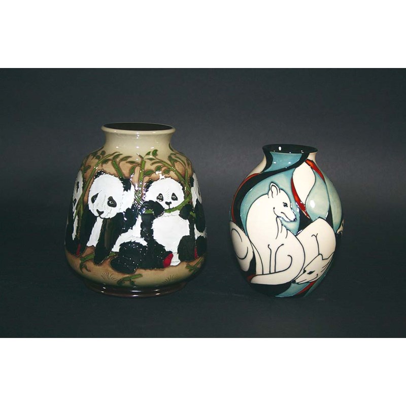 a modern Moorcroft vase designed with Panda's, in The Family design and designed by Marie Penkethman. Also with a Moorcroft vase in the Arctic Fox design, designed by Kerri Goodwin. The Family Vase marked, Moorcroft, 2010, 206. 6ins (15cms) high. (2)