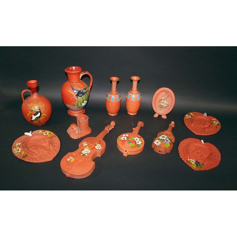 a collection of terracotta items including 3 musical instruments, Mouse Match Holder, Pair of Vases, two jugs painted with Birds, and various other items. (12)