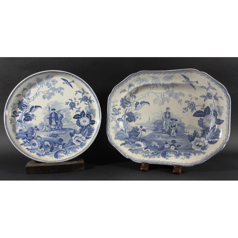 possibly Charles Meigh or Minton, comprising a platter with two men and a boy, a circular cake stand with three men, one seated, and a footed, two handled bowl with various gardener scenes, printed marks, the bowl stamped Improved Stone China (3)