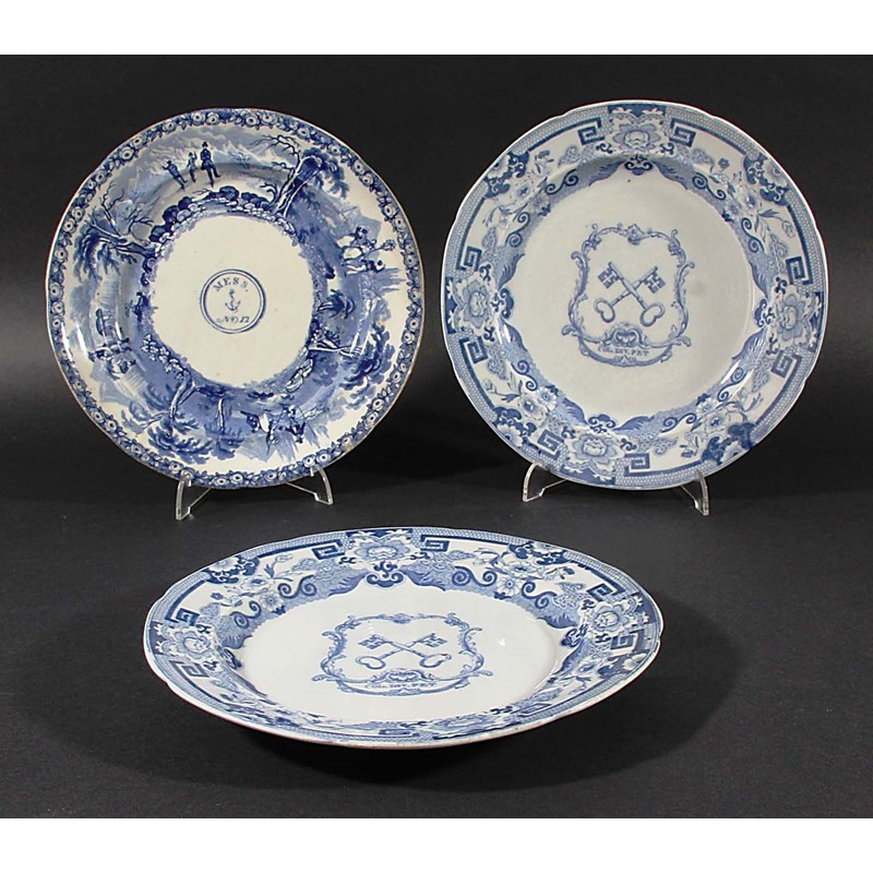 blue transfer printed with Mess No 12 inside a broad boarder with rural scenes of the seasons, diameter 24cm; together with a pair of Mason's Ironstone plates, blue printed with a pair of cross keys above the motto Col. Div. Pet. inside a cartouche and a chinoiserie border, printed marks, diameter 24cm (3)