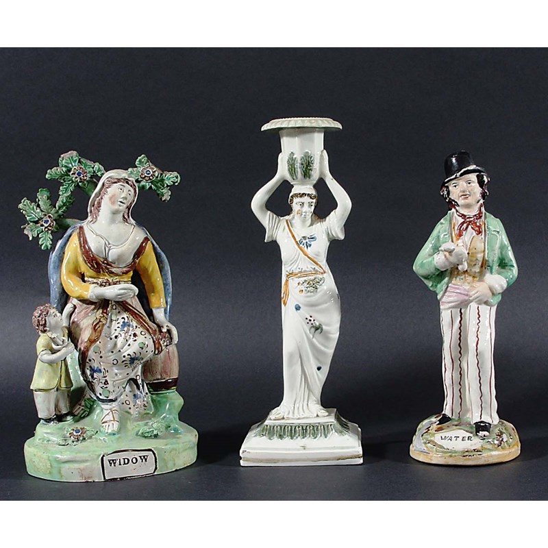 circa 1800, a classical maiden holding up the sconce, height 25cm; together with a pearlware Widow bocage group in pratt type colours and a Kent Gin and Water figure (3)