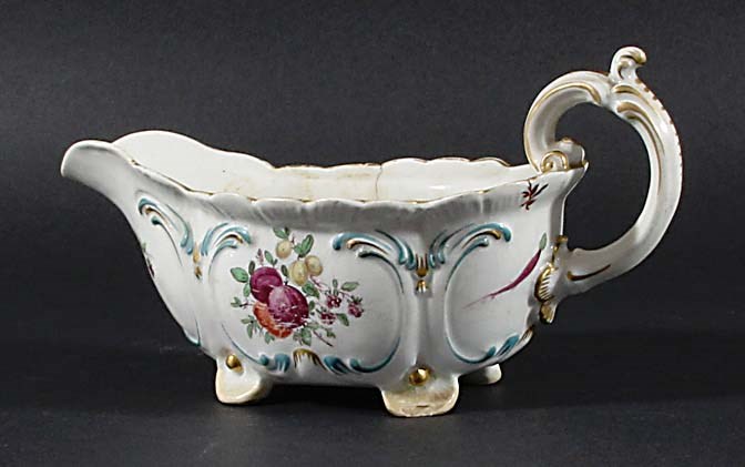 CHELSEA SAUCE BOAT, of silver shape painted with cartouches of fruit and flowers, iron red anchor, length 19cm
