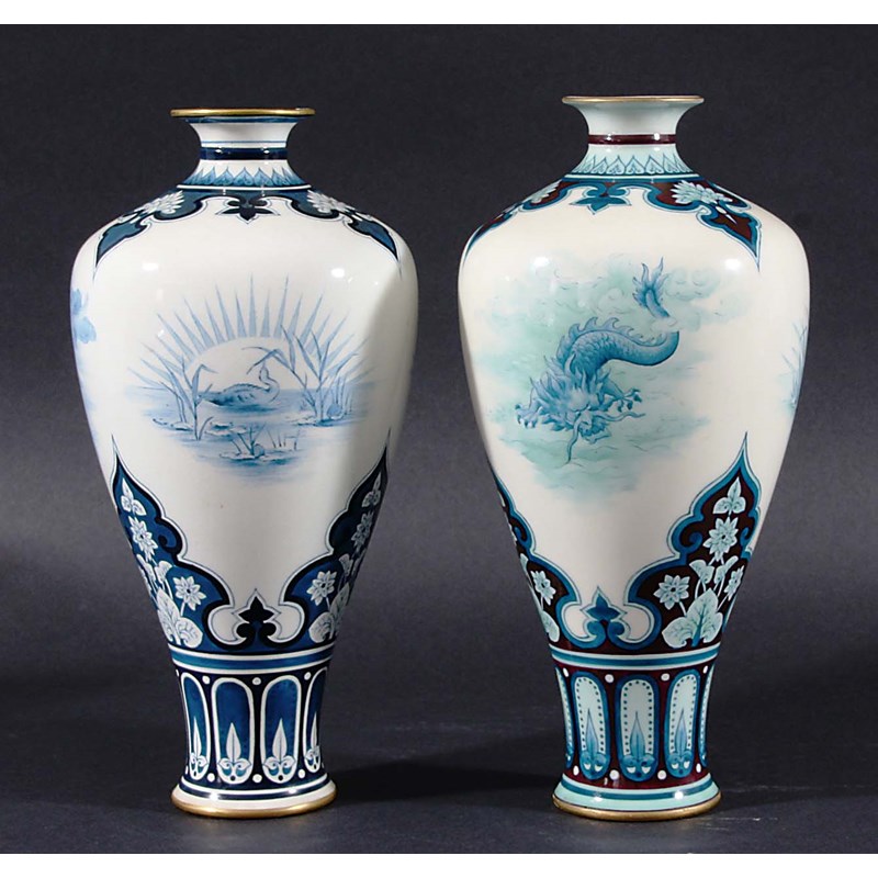 later 19th century, painted with a Chinese dragon and scenes of ducks between Persian style shoulders and base, puce printed mark and green F106/5, height 23cm (2)
