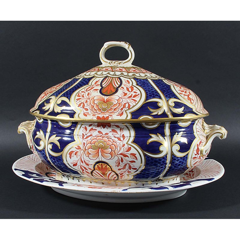 BLOOR DERBY IMARI TUREEN, COVER AND STAND, with scrolling handles, iron red printed mark, length of tureen 40cm (3)