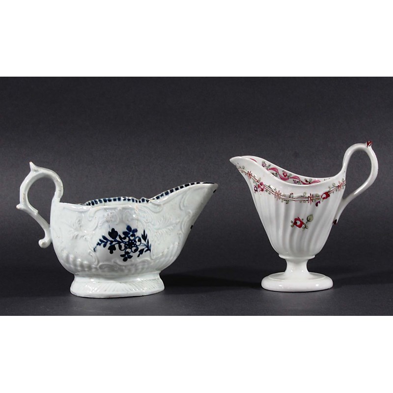 circa 1780, of quatrefoil form, blue painted with floral sprigs inside moulded scrolling cartouches, length 17cm; together with a Newhall helmet form cream jug, with moulded wrythen and painted decoration, height 12cm (2)