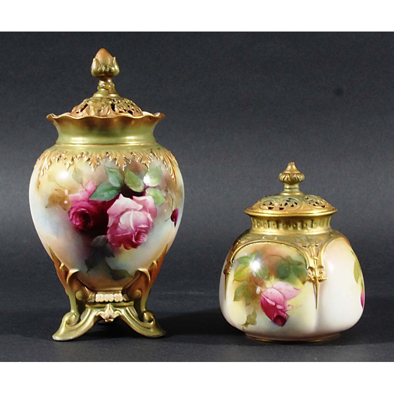 TWO ROYAL WORCESTER POT POURRI VASES AND COVERS, 1907 and 1919, each painted with roses, green and puce printed marks, heights 19cm and 12cm (4)