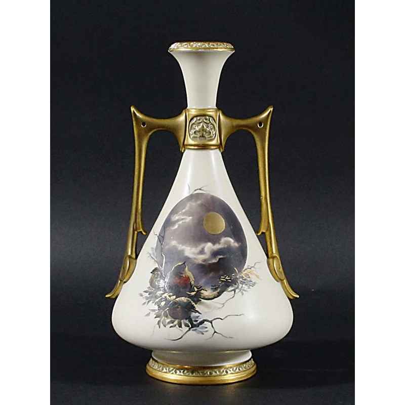 ROYAL WORCESTER VASE, circa 1880, Persian shape 1021, painted with a moonlit scene of robins in a tree, puce printed marks, height 25.5cm