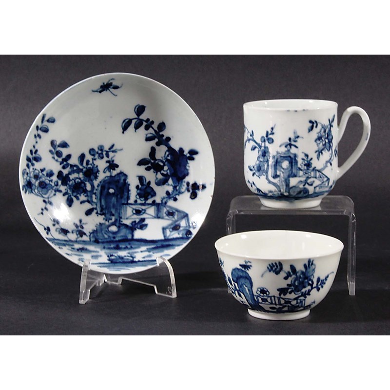 circa 1755-60, blue painted in the Prunus Fence pattern, blue painted workmen's marks, saucer diameter 11.75cm (3)