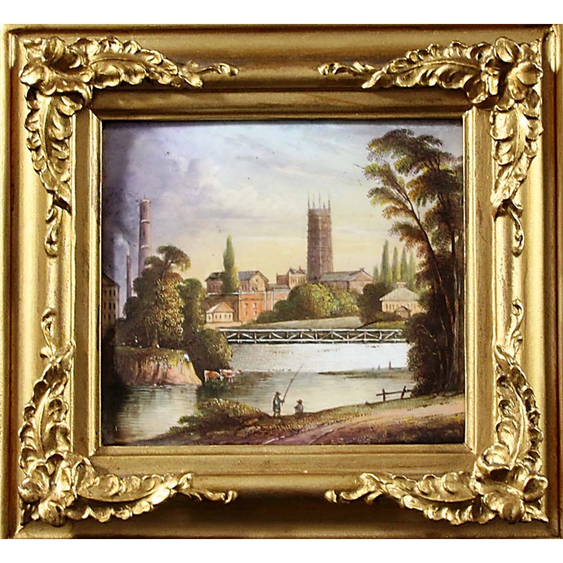 ENGLISH PORCELAIN PLAQUE, circa 1810, probably by Daniel Lucas, titled 'View of Derby', 12cm x 13cm