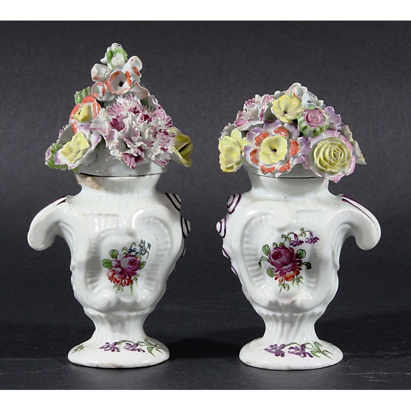 circa 1750-60, of rococo form painted with floral sprigs with puce highlights, with floral encrusted covers, iron red 4 and 6, height 14cm (4)