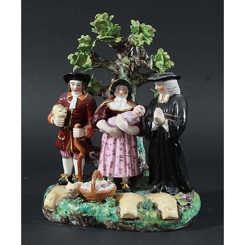 DERBY TITHE PIG GROUP, Stevenson and Hancock period, the three figures standing before a tree, puce painted mark, height 21cm