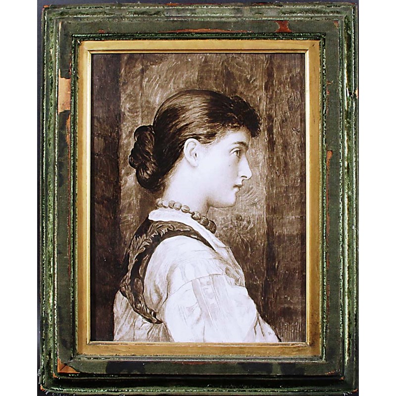 STYLE OF EDWARD JOHN GREGORY, Pre-Raphaelite style portrait of a young lady, monochrome on a porcelain plaques, monogrammed lower right, 35cm x 26cm