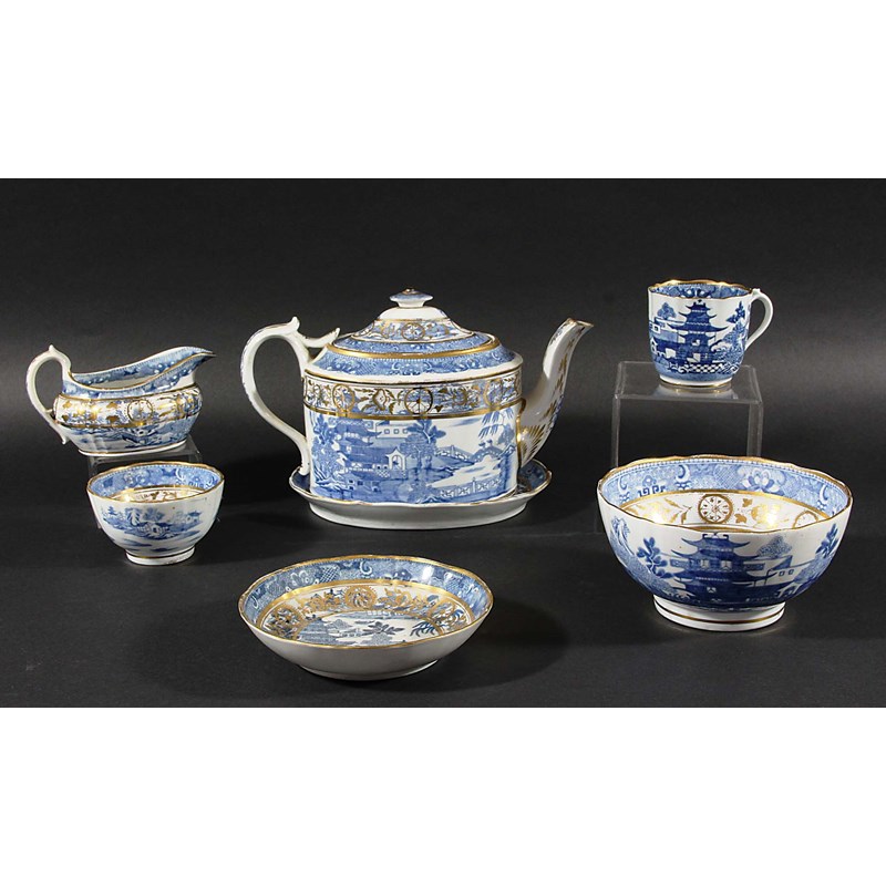 circa 1800, probably Miles Mason, transfer printed with gilt highlights with a willow type scene, comprising teapot, cover and stand, sucrier and cover, slop bowl, cream jug, eleven coffee cups, eight tea bowls and seven saucers; together with three similar coffee cups (33)