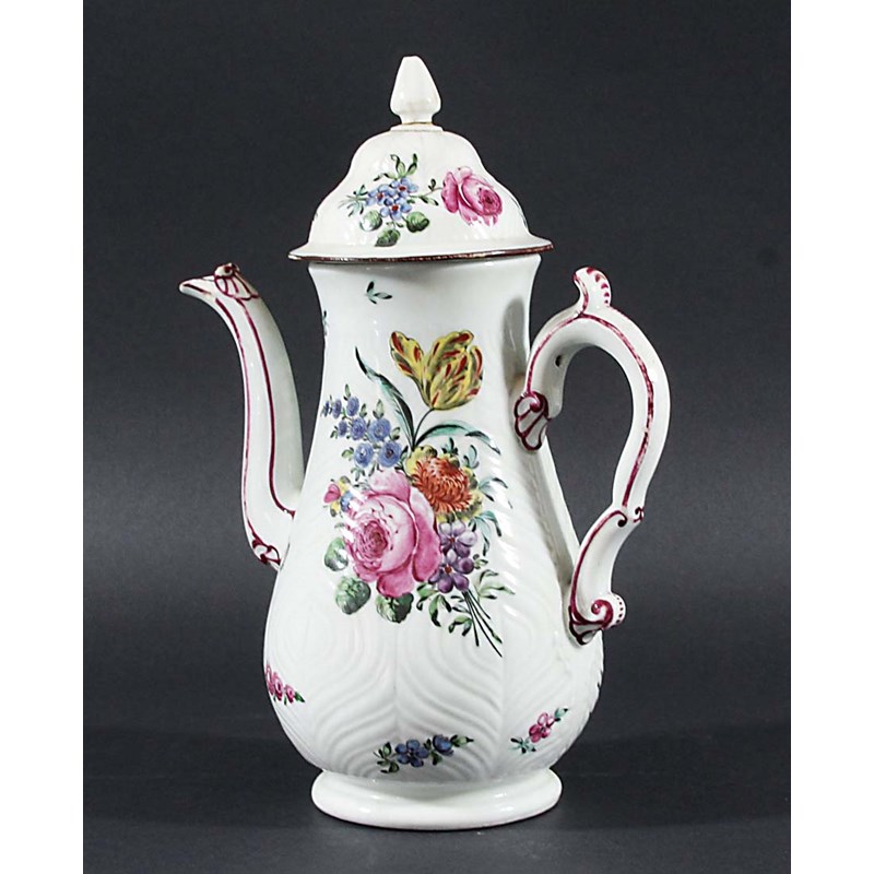 WORCESTER COFFEE POT AND COVER, circa 1760-70, of baluster form, with moulded feather decoration, and outside painted with rose floral sprays, the cover with similar moulded and painted decoration, height 26cm (2)