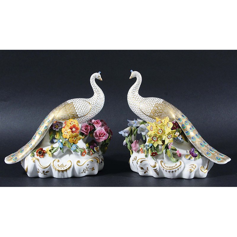PAIR OF DERBY PEACOCKS, Stevenson and Hancock period, with gilt tails and standing amongst encrusted foliage, puce factory marks, length 18cm (2)