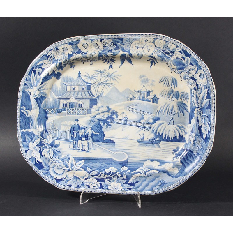 DAVENPORT BLUE TRANSFER PRINTED PLATTER, circa 1810, the Chinoiserie scene of three figures on a jetty, footpaths and pagoda behind, impressed marks, 27cm x 37cm