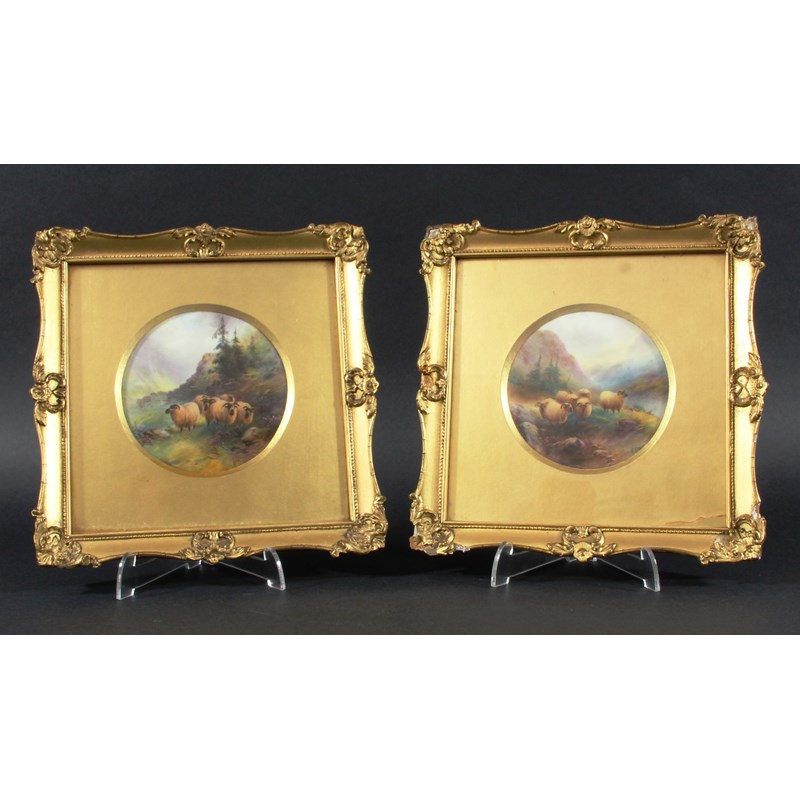 PAIR OF ROYAL WORCESTER CIRCULAR PLAQUES, date code for 1920, signed H Davis, painted with sheep in highland settings, puce factory marks, framed, diameter 10cm (2)