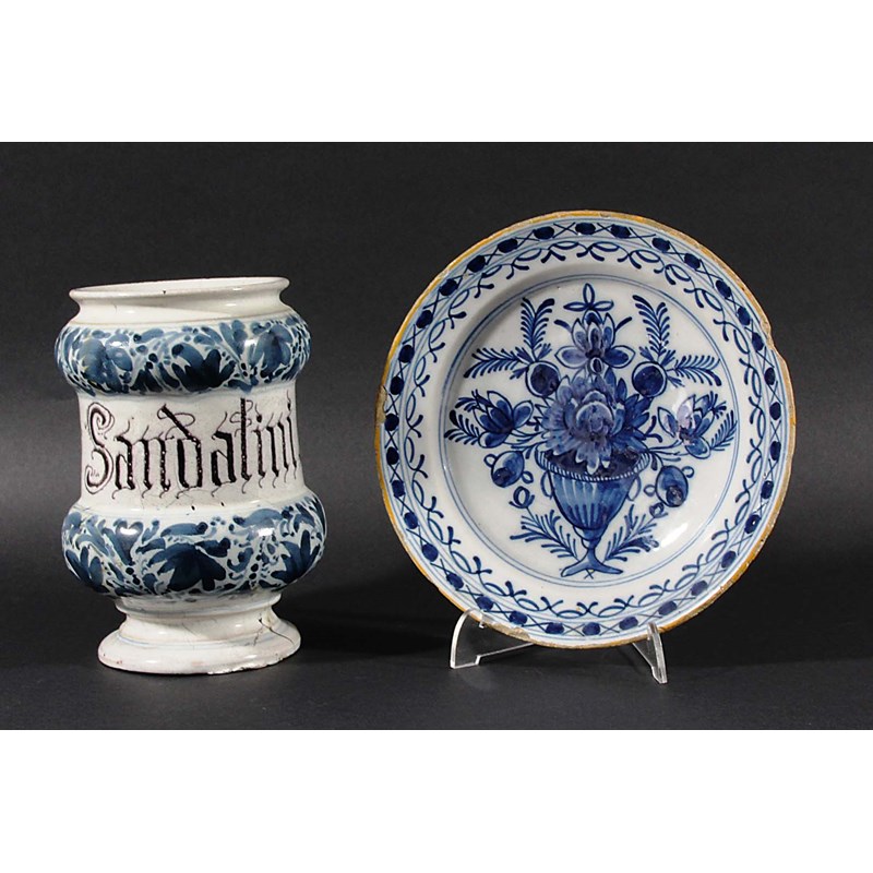 17th century style, inscribed Sandalini between blue floral bands, height 18cm; together with a Dutch delft plate blue painted with a vase of flowers, diameter 19.5cm (2)