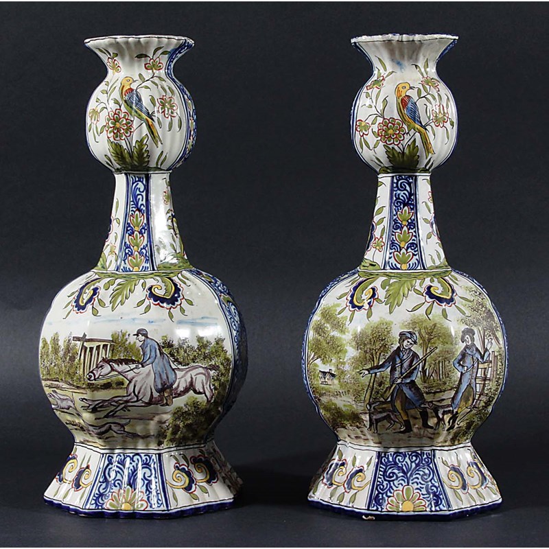 possibly late 18th century, the garlic style neck above an octagonal baluster body painted with hunting scenes, iron red D and E to the base, height 31cm (2)