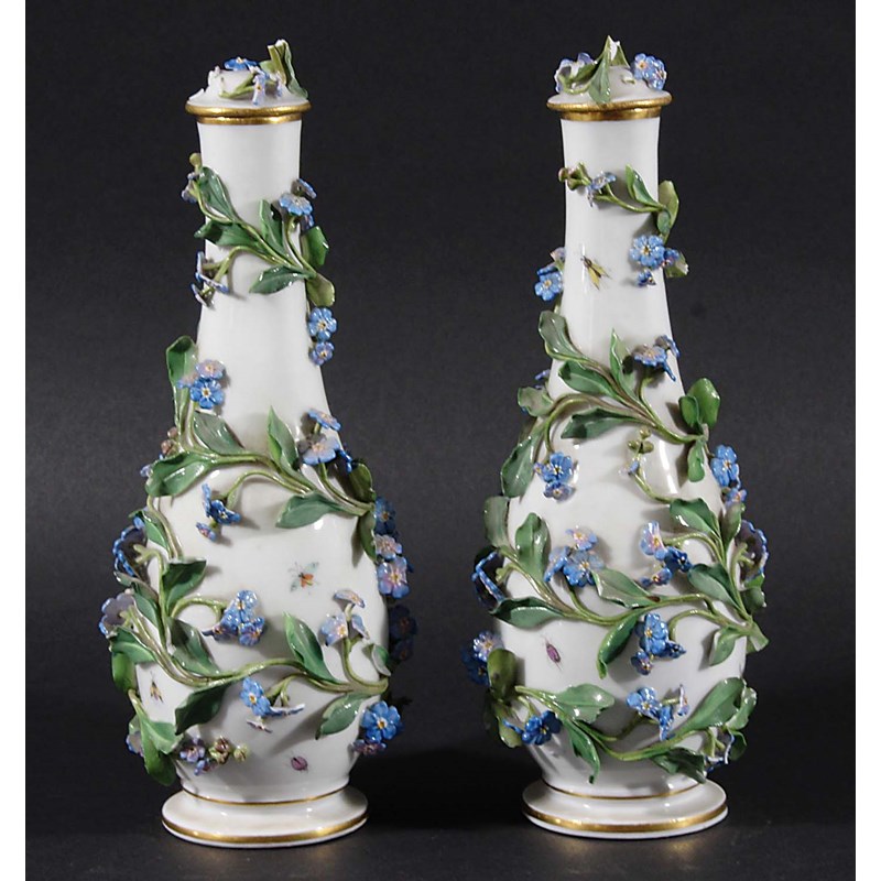 PAIR OF MEISSEN FLORAL ENCRUSTED VASES AND COVERS, 19th century, of bottle form, with meandering forget-me-not decoration, blue crossed sword and other marks, height 21cm (2)