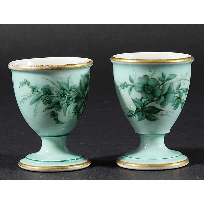 PAIR OF PARIS PORCELAIN EGG CUPS, 19th century, painted with flowers on a green ground, gilt rims, height 6cm (2)