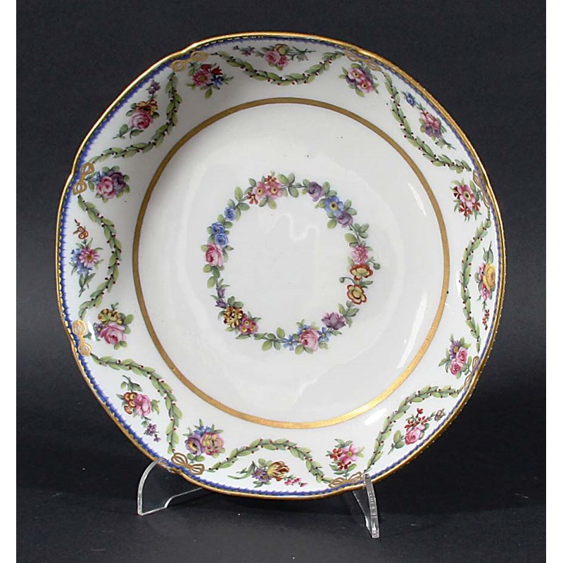 date code Z for 1777, a central floral wreath in side a gilt band, laurel leaf swags with gilt ribbons and floral sprays and a blue feathered rim, grey interlinked Ls, gilders mark, blue Z, diameter 21.5cm