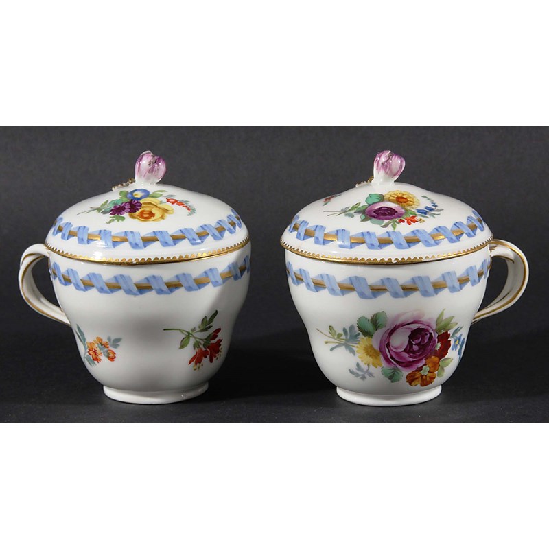 PAIR OF MEISSEN MARCOLINI PERIOD CUPS AND COVERS, circa 1800, painted with floral sprays beneath blue and gilt ribbons, the covers with flower bud finials, underglaze blue marks, height 9.5cm (4)