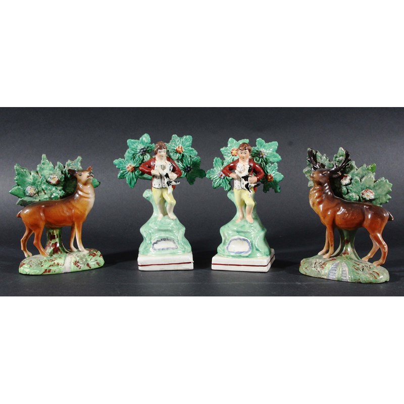 circa 1800, standing astride a stream, height 14cm; together with two Walton style bocage groups of men and dogs on a square base, height 15cm (4)