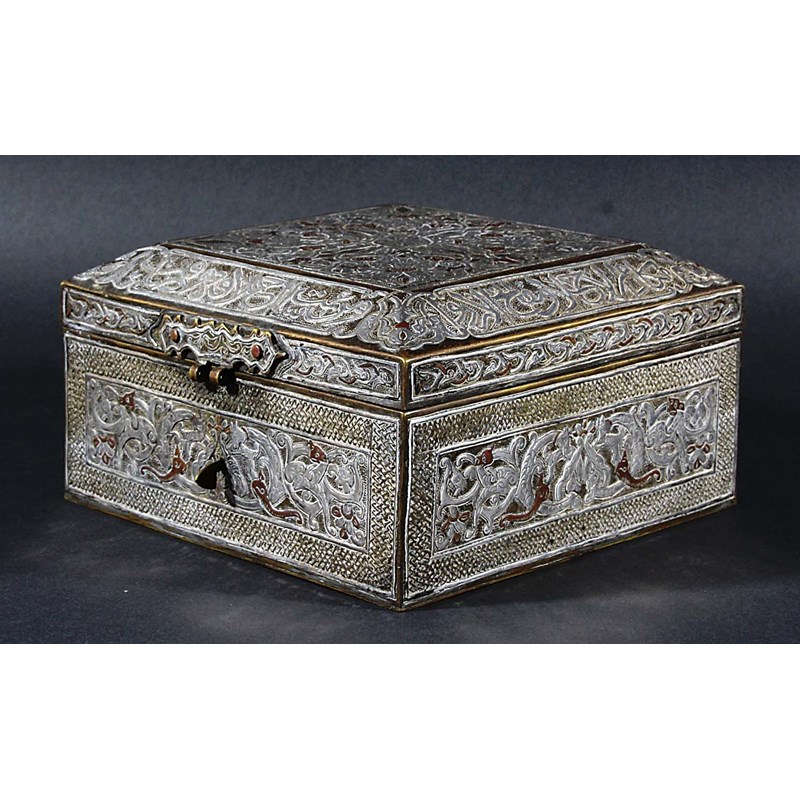 19th century, inlaid with silver and copper with scrolling foliage and arabic script, height 10cm, width 17.5cm, depth 17.5cm