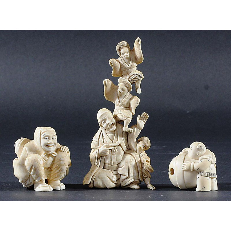 carved as a man squatting, a bag of masks on his back, signed, height 5cm; together with another of a boy resting on a giant bell, signed; and an okimono of a man balancing three birds in outfits on his shoulder, height 12cm (3)