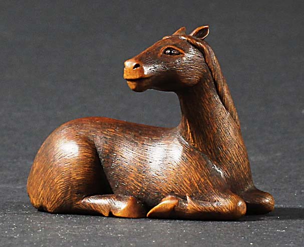 JAPANESE BOXWOOD OKIMONO OF A RECUMBENT HORSE, with glass eyes, signed, length 4.5cm