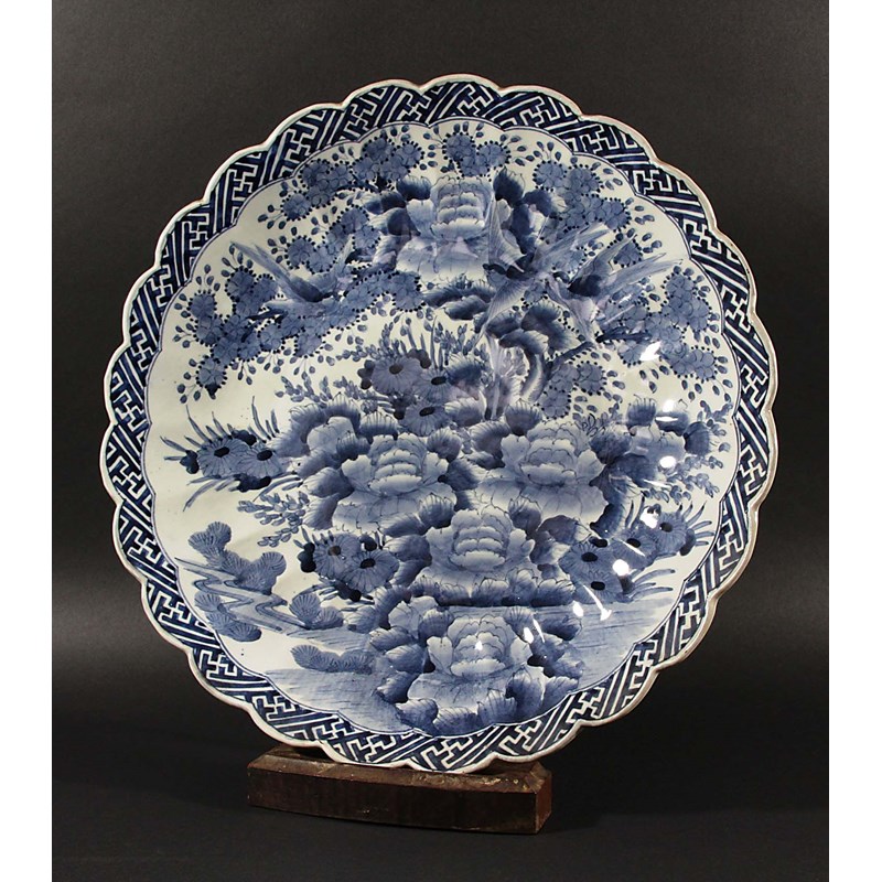 JAPANESE BLUE AND WHITE CHARGER, of scalloped form, painted with a floral garden scene, diameter 46cm