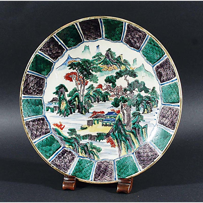 JAPANESE KUTANI CHARGER, painted with pagoda on rocky islands before mountains, iron red mark, diameter 33cm