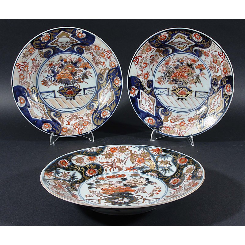 probably early 19th century, painted with a vase of flowers on a veranda, diameter 24cm; together with a pair of hardwood stands and another plate, slightly larger, diameter 27cm (5)