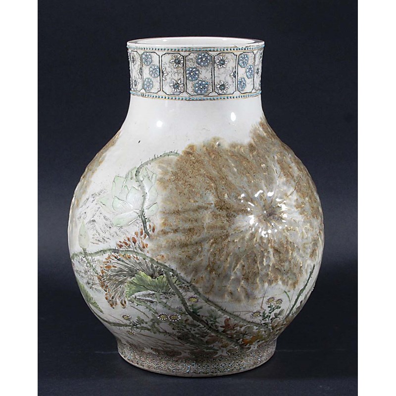 Meiji, decorated in relief with oversized flowerheads and painted with further flowers, a kingfisher and a landscape beyond, gilt and iron red signature, height 28cm