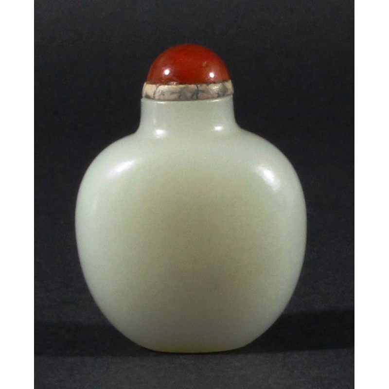 CHINESE PALE JADE SNUFF BOTTLE AND STOPPER, of flattened ovoid form and cornelian stopper, height 6cm