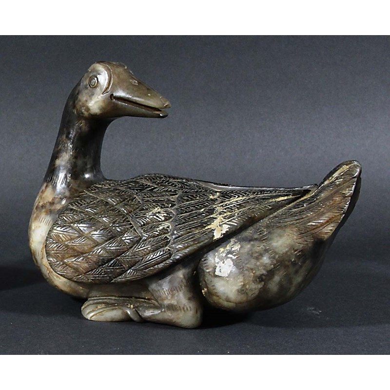CHINESE SOAPSTONE DUCK, mottled grey, carved seated with it head turned to look backwards, length 21cm