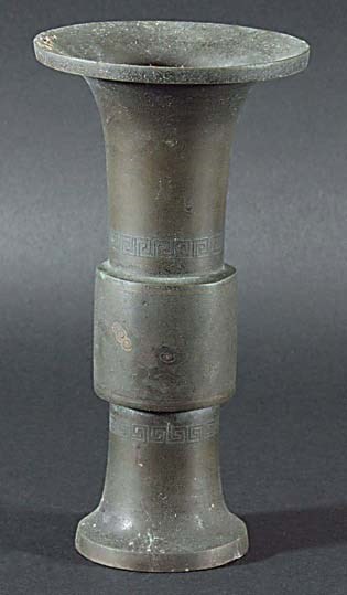 CHINESE BRONZE ARCHAISTIC GU VASE, carved and inlaid with lions on a 'seaweed' ground, 18.5cm