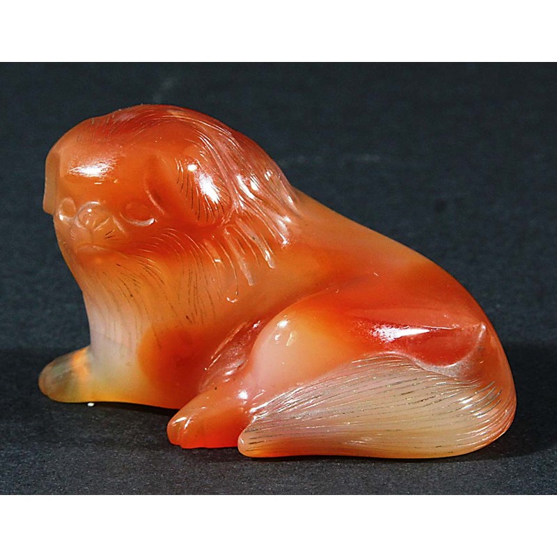 CHINESE CORNELIAN CARVING OF A PEKINESE DOG, lying facing left, length 6.5cm