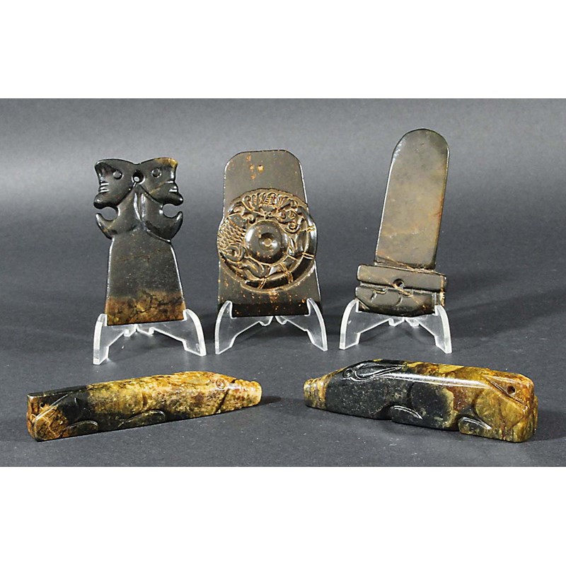 CHINESE SUNG STYLE HARDSTONE CEREMONIAL SET, possibly Qianlong, comprising three axe head shapes and two recumbent pig rests (5)