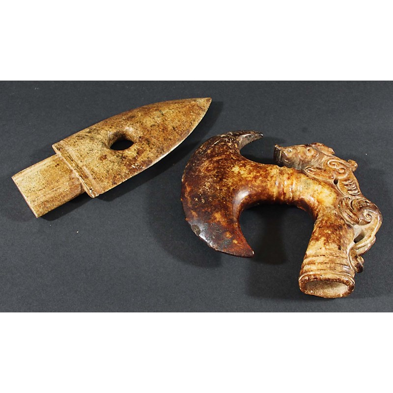 CHINESE ARCHAISTIC AXE HEAD, in a mottled brown jade type stone, carved with an animal mount, length 18cm; together with a stone spear head, length 19cm (2)