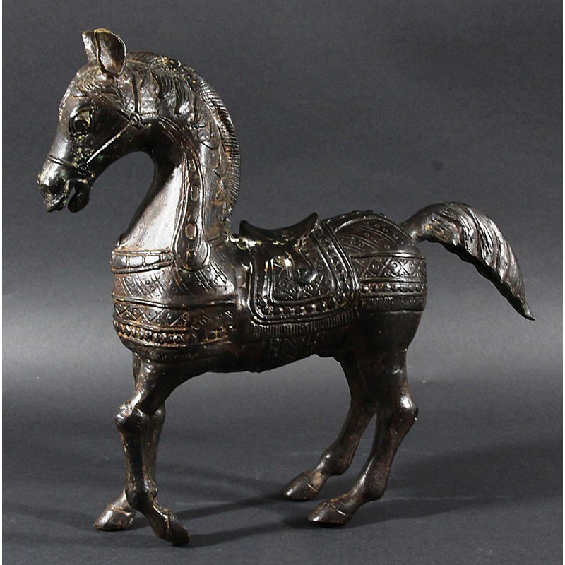 CHINESE BRONZE HORSE, archaistic style, standing saddled up, height 31cm
