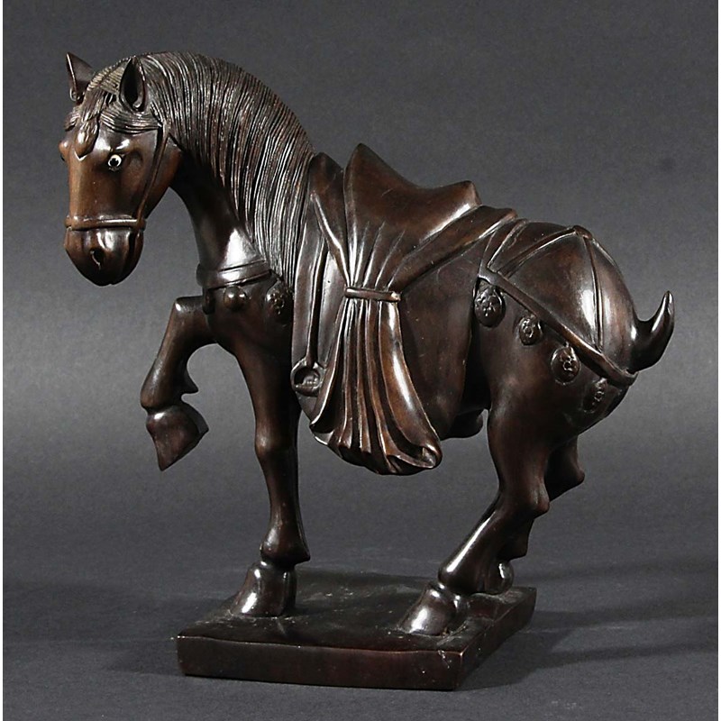 CHINESE CARVED WOOD HORSE, standing with one leg raised, glass eyes, height 21cm, length 19cm
